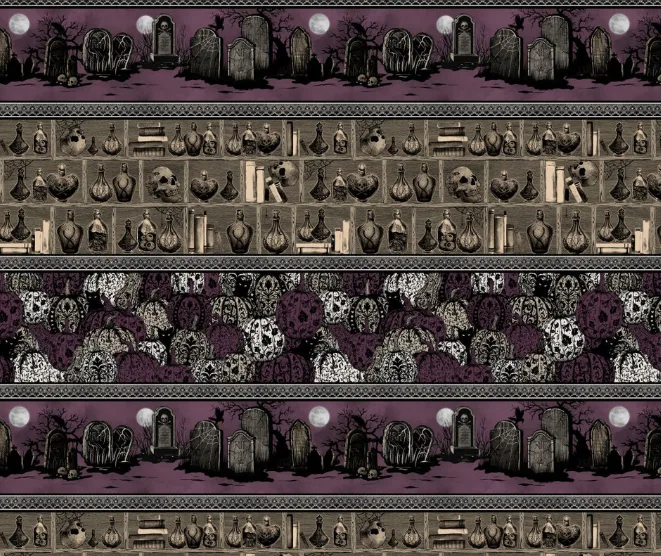 Darkly Enchanted Stripe with Pumpkins, Cemetery, and Potion Shelf